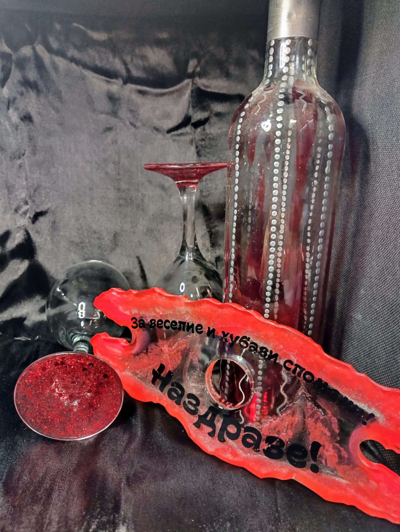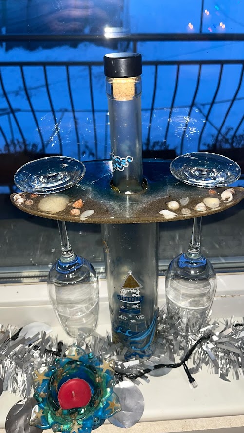 Този комплект за вино със стойка и чаши от епоксидна смола съчетава елегантност, функционалност и уникален дизайн. Изработен изцяло на ръка, всеки комплект е различен и носи собствен стил и характер.