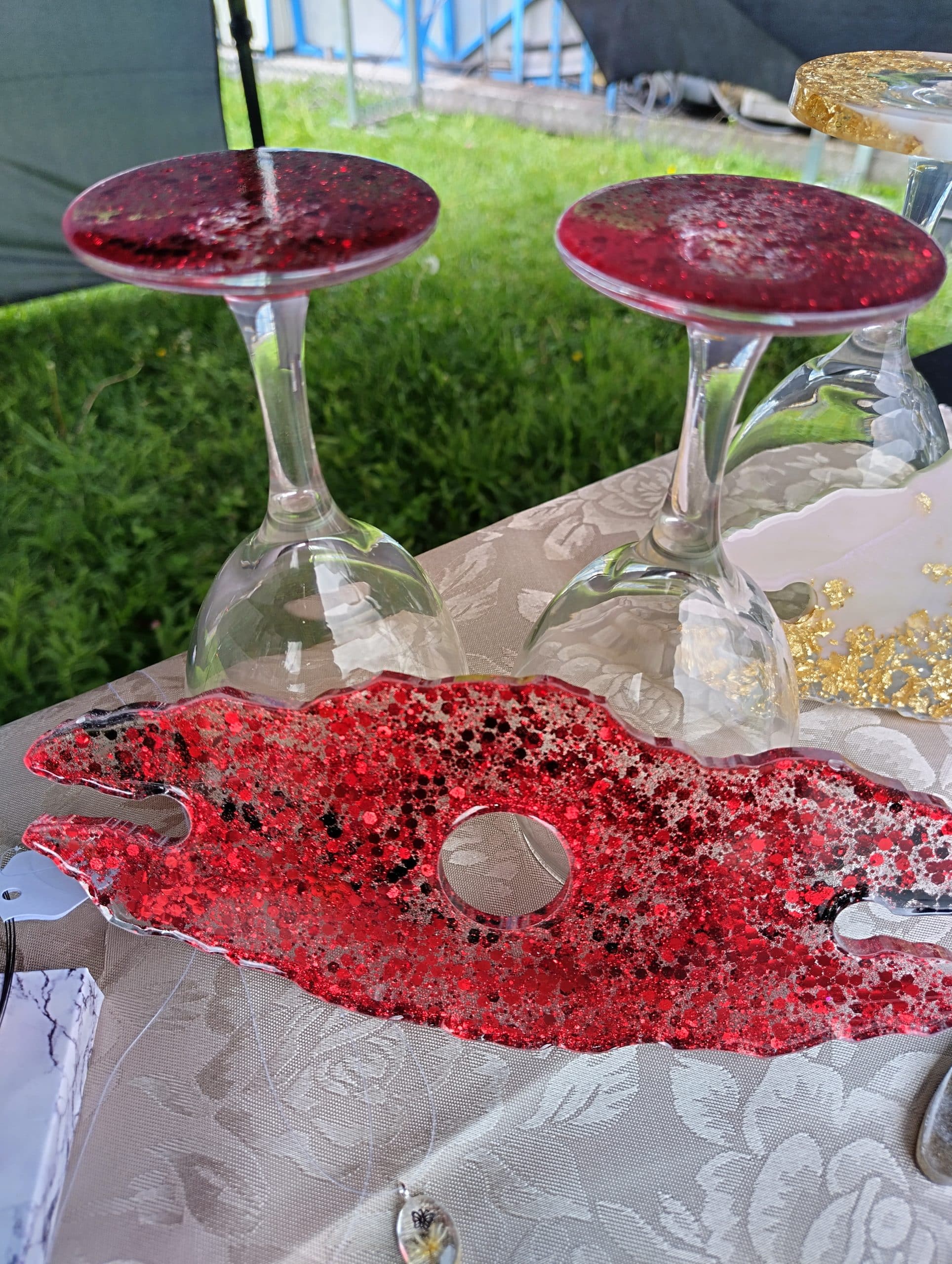 Стойката е създадена така, че да държи чашите стабилно и елегантно, превръщайки комплекта в красив акцент за масата, кухнята или домашния бар. Благодарение на ефектите и цветовете на епоксидната смола, всяко изделие изглежда модерно и впечатляващо.