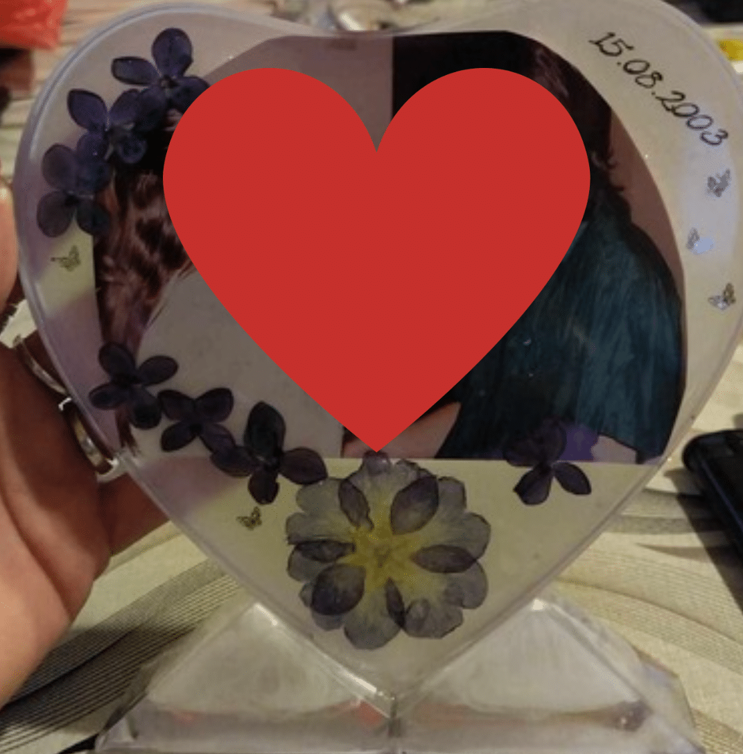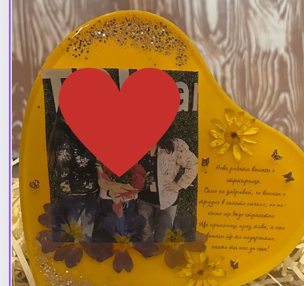 Нашата визитка е изцяло ръчно изработена и напълно уникална – създадена по поръчка и изцяло според вашите желания. Формата е сърце с удобна стойка, изработено от кристално чиста смола, което го прави елегантен и стилен акцент за вашето бюро или подарък.